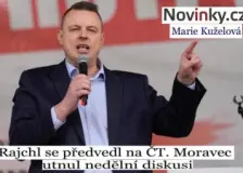 Dobře udělal, měl právo. Moravec našel zastání za předčasný konec15:09 » ParlamentniListy.cz Po předčasném ukončení nedělní debaty Otázek Václava Moravce se její moderátor dočkal výrazné podpory veřejnosti. Publicista Ondřej Neumann označil jeho krok za správný. Na sociálních sítích někteří volali po přísnějších pravidlech pro hosty, kteří … Hysterický záchvat Jindřicha Rajchla - vyzve Václava Moravce na souboj?15:09 » Seznam Médium Nedělní polední nudu ve vysílání České televize včera oživily nezvykle výživné otázky Václava Moravce. Ženská vlna dostihla technology moci v Pirátské straně14:48 » Deník Referendum Vedení Pirátů podcenilo fakt, že velkou část jejich voličstva tvoří ženy mladšího věku. A ty opravdu na machistické praktiky ambiciózních mužů kolem Ivana Bartoše a Zdeňka Hřiba nejsou zvědavé. U voleb to daly jasně najevo. Ego místo nadhledu. Proč Václav Moravec vypnul zbytečně debatu? Měl by skončit14:37 » Seznam Médium Otázky Václava Moravce skončily předčasně. Žádný chaos, žádný křik – jen moderátor, který ztratil nervy. Byla to snaha zachovat pořádek, nebo spíš důkaz, že jeho ego už neuneslo vlastní formát? Moderátor Moravec ukončil televizní debatu rozhádaných poslanců předčasně14:16 » The Epoch Times Nedělní debata čtyř politiků se zvrhla do té míry, že se jí moderátor Václav Moravec rozhodl ukončit. The post Moderátor Moravec ukončil televizní debatu rozhádaných poslanců předčasně appeared first on Epoch Times ČR . Fiakry končí, koloběžky taky. Praha vládne zákazem14:05 » Naše Praha Pražská koalice během jediného jednání rady zvládla zlikvidovat tradici starou přes sto let i moderní formu udržitelné dopravy. To vše v duchu hesla: když nevíme co s tím, pojďme to celé smést ze stolu. Končí tradiční koňské povozy v centru Prahy, i… Praha od ledna zakáže sdílené elektrokoloběžky. Město reaguje na stížnosti obyvatel i vysokou nehodovost13:32 » E15.cz Od ledna 2026 zmizí z pražských ulic sdílené elektrokoloběžky. Radní schválili v pondělí nový systém regulace sdílené mobility, který umožní provoz pouze kol a elektrokol s povolením Technické správy komunikací. Podle magistrátu koloběžky představuj… Teatrální Moravec selhal jako moderátor. Přesto OVM potřebujeme13:00 » Seznam Médium Nedělní Otázky Václava Moravce se zvrhly v chaotickou hádku, kterou moderátor nezvládl ukočírovat. Hřib s Rajchlem převzali kontrolu nad debatou a Moravcovi nakonec nezbylo, než pořad předčasně ukončit. Přesto má tento pořad na ČT své pevné místo. Rajchl: vážená paní Marie Kuželová z provládního pamfletu Novinky.cz.12:49 » Skrytá pravda Jednoznačně souhlasíme s prohlášením JUDr Jindřicha Rajchla. A součástí bude tvrdá stížnost k rukám Rady Čt a žádost o nápravu, aby se to už nikdy neopakovalo. (Bude zveřejněna dnes, k večeru, v 17:00, a byla už odeslána) "Slušnost není slabost." Moravec utnul nedělní pořad ČT, pak vyťukal morseovku8:43 » Aktuálně.cz Část pořadu Otázky Václava Moravce skončil předčasně. Šlo o reakci na hádky Jindřicha Rajchla (PRO), Patrika Nachera (ANO) a Zdeňka Hřiba (Piráti). |