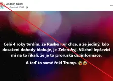 Filip Turek veřejně uráží celou Poslaneckou sněmovnu: Na drsná slova zareagovali hlavně Piráti4:46 » Svět kreativity Příspěvek Filipa Turka na sociálních sítích evidentně naštval některé politiky. Kritika Poslanecké sněmovny a Pirátů vyvolala rychlou reakci. Vedení České televize se ostře pustilo do Moravce. Obvinění z podrývání důvěry i kritika kvůli Okamurovi21:54 » eXtra.cz Václav Moravec během nedělního vysílání pořadu Otázky Václava Moravce překvapil diváky svým vyjádřením, že po 21 letech končí. Jako důvod svého odchodu uvedl, že za současných podmínek nemůže dál zaručit nezávislost redakční práce a kritickou reflex… Bukovský: Spousta lidí žije v totálním odtržení od přírody. Je to nebezpečný extrém19:11 » PrahaIN.cz ROZHOVOR: Igor Bukovský je znám tím, že byl v době protipandemických opatření jejich kritikem. „Existují klinické důkazy, že pravidelný pobyt v přírodě snižuje například krevní tlak. Každý člověk, který dokáže navázat kontakt s přírodou, pozná její … „Trump loni prohlásil, že vymazal jaderný potenciál Íránu, k útoku se nechal dotlačit. Chameneí bránil vývoji jaderné zbraně. N18:35 » XTV.cz Změnil se od soboty pohled bezpečnostního experta Andora Šándora na to, proč byly zahájeny izraelsko-americké útoky na Írán? Proč k nim došlo právě teď? Silně je cítit podtext, že Benjamin Netanjahu v žádném případě nechtěl Íránu připustit jakýkoli … Rajchl a pirátka Stojanová se neudrželi v přímém přenosu: V ostré hádce padala i obvinění z rasismu12:07 » Svět kreativity Diskuse o volební kampani skončila hádkou. Ve studiu se střetly dvě úplně jiné představy o tom, kde končí politická kritika a začíná rasismus. Václav Moravec končí se vztyčenou hlavou. Česko stojí na prahu diktatury9:06 » Seznam Médium Václav Moravec po 21 letech končí v České televizi. Největší radost z toho mají hulváti typu Babiš, Okamura nebo Rajchl. Moravec však odchází s hlavou nahoře, zachovanou tváří a jako profesionál. Trumpův výrok nepotvrzuje, že „Rusko chce mír“. Rajchl vybírá jen to, co se mu hodí8:44 » manipulatori.cz Předseda PRO Jindřich Rajchl napsal, že už čtyři roky tvrdí, že „Rusko mír chce“ a že jediným, kdo dohodu blokuje, je Volodymyr Zelenskyj, a že The post Trumpův výrok nepotvrzuje, že „Rusko chce mír“. Rajchl vybírá jen to, co se mu hodí appeared fir… Miliony v dolarech a zlato pro Ukrajinu. Rajchl mluví o praní peněz9.března » prvnízprávy.cz Zadržení transportu hotovosti a zlata směřujícího na Ukrajinu vyvolalo ostré reakce. Advokát a poslanec Jindřich Rajchl tvrdí, že jde o praní peněz a vyzývá k zastavení podpory Kyjeva. Rajchl: Jsem nesmírně rád, že Moravec z ČT odešel8.března » ParlamentniListy.cz Poslanec a předseda strany PRO Jindřich Rajchl se vyjádřil k dnešnímu dílu Otázek Václava Moravce. Hovořil o „nedůstojném vyvrcholení kariéry“ Václava Moravce i o údajném porušování etického Kodexu ČT. Václav Moravec se zhroutil: zákon o hospodaření a prověření jeho výplat nepřežil.8.března » Skrytá pravda Manipulátor veřejnoprávní televize, která začala svoje dezinformace rozdávat před vstupem do EU, (2000 - 2004) odešel do věčných lovišť mediálního marasmu. A závěr stál za to! Konec Moravce v České televizi: Vládní politici slaví, jiní jeho práci oceňují8.března » Deník.cz Reakce politiků, osobností a novinářů na odchod moderátora Václava Moravce z České televize zaplavily sociální sítě. Zatímco část ocenila jeho jednadvacetiletou práci, někteří lidé vítají, že končí. Mezi nimi jsou i představitelé současné vlády. |
