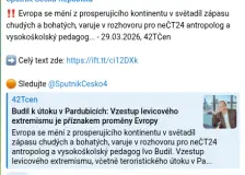 „Slabá a ubohá“: proč EU nevyužívá svůj vliv k zastavení Izraele?9:26 Hluboké rozdíly v názorech na Izrael znamenají, že unie selhala v reakci na situaci v Libanonu, Gaze a násilí osadníků na Západním břehuLidské škody izraelských útoků na Libanon byly jasně vidět, když irský europoslanec Barry Andrews minulý měsíc navštívil Bejrút. Setkal se s lidmi, kteří uprchli před izraelskými leteckými údery a uposlechli evakuačních rozkazů v jižním Libanonu.V provizorních úkrytech – upravených školách – byly podmínky ještě horší než během posledního izraelského vpádu v roc… Ve svém večerním projevu Trump tvrdil, že válka s Íránem se „blíží ke konci“, a snažil se konflikt ospravedlnit9:26 Trhy klesají poté, co prezident poskytl jen málo podrobností o tom, jak hodlá konflikt v příštích dvou až třech týdnech ukončit Donald Trump využil středeční večerní projev k národu v hlavním vysílacím čase k tomu, aby prohlásil měsíční válku v Íránu za úspěch, který se „blíží ke konci“, a to navzdory eskalujícímu konfliktu, který způsobil ekonomické otřesy po celém světě, narušil transatlantické spojenectví a snížil popularitu tohoto prezidenta. „Platba do sedmi dnů“: Novozélandský lékař vystavil americké ambasádě fakturu za rostoucí náklady na benzín9:26 Shane Dunphy zaslal účet na téměř 3 000 dolarů spolu s dopisem, v němž uvádí: „Za tuto situaci nesou odpovědnost USA, a proto by měly nést následky“ Nejen globálně a nejen technologické firmy, ale třeba pojišťovny v Česku propouštějí kvůli AI, ačkoliv mají zisk0:55 Včera Oracle vyhodil emailem 30 000 lidí. Jedním emailem v šest hodin ráno, píše Alex J. Bruno na sociální síti. Žádný telefon od manažera, žádný meeting, žádný varování. Jen email podepsaný jako "Oracle Leadership", přístup do systémů okamžitě zablokovaný. Zaměstnanci se to dozvěděli dřív, než si stihli uvařili kafe. Zkuste si to jen představit, nekončí jedno oddělení, ani celý jedno patro, ale … Deset dní do Maďarských voleb0:55 Za deset dní čekají Maďarsko parlamentní volby. Poprvé za dekádu to vypadá, že by proti Viktoru Orbánovi, který si z desetimilionové země udělal za šestnáct let své vlády cosi na způsob osobního pašalíku, mohl mít někdo šanci. Tímto vyzyvatelem je strana Tisza, která i v poslední průzkumech z konce března vede až o jedenáct procentních bodů. Její lídr Péter Magyar původně také vyšel ze stáje Fide… Šéfredaktor Aktuálně.cz si nemůže pomoci, Motoristé jsou mu tak nějak blíž0:55 Nekompetentní, opakovaně zdiskreditovaný Motorista Klempíř se dopustil další z mnoha nedůstojností, když otevřeně zpochybnil práva menšin na kulturní podporu. V šéfredaktorovi Aktuálně.cz Zrnovi našel díky jeho bigotní ideologické zaslepenosti obhájce. Následující text obsahuje vulgarity a hovorové výrazy. Vzhledem k tomu, jaké téma a jaké činy text komentuje, považuje redakce za snesitelné ponec… Evropě bude lépe, když se nebude spoléhat na Američany a NATO0:55 Ve Washingtonu Donald Trump a Marco Rubio otevřeně zpochybňují závaznou povahu NATO — hrozí stažením, naznačují, že práva na základny a vzájemné závazky jsou podmíněné politické nástroje. V Minsku Alexandr Lukašenko prohlašuje, že Bělorusko se „připravuje na válku." Dohromady tato prohlášení narušují běžně přijímané předpoklady poválečného (post–studenoválečného) pořádku, v němž Spojené státy spo… Spolek Babišovy poradkyně otevřeně hájí ruskou propagandu0:55 Zpolitizovaná BIS, nenávistní novináři. Takhle diskredituje tzv. Společnost pro obranu svobody projevu kontrarozvědku a Seznam Zprávy za to, že poukazují na dezinformační zdroj šířící ruskou propagandu. Ze spolku pochází Babišova poradkyně. Zpráva výzkumného institutu STEM0:55 Důvěra v prezidenta Petra Pavla je nejvyšší mezi mladými lidmi a lidmi s vysokoškolským vzděláváním, v obou případech dosahuje zhruba 75 %. Se vzděláním a věkem významně klesá. Channel 4 News: Odejdou USA z NATO?22:16 Moderátorka, Channel 4 News, středa 1. dubna 2026, 19 hodin: Donald Trump má dnes večer pronést televizní projev, ve kterém podle očekávání oslaví to, co považuje za americké vojenské úspěchy v Íránu. Trump dříve prohlásil, že válka skončí za dva nebo tři týdny a že prezident nového íránského režimu ho požádal o příměří. Teherán toto označil za lživé a nepodložené tvrzení a íránský prezident před… Trump oznámil, že zvažuje vystoupení USA z NATO22:16 Co na to české Babo-MAGA vidíme níže, co na to další čeští kšiltovkáři (Vondra, Skopeček, Hraba atd), se jenom domýšlíme. (Ale ta Kamala, no to by byla hroznáááá prezidentka, že). Izraelské vraždění nevinných civilistů pokračuje19:36 Izraelský útok bez varování zasáhl jižní bejrútskou čtvrť Jnah – při něm zahynulo nejméně pět lidí. Izrael tvrdí, že při dvou samostatných útocích v libanonském hlavním městě zabil vysokého představitele Hizballáhu a dalšího vysokého představitele. An Israeli strike hit the southern Beirut neighbourhood of Jnah without warning – killing at least five people. Israel say they killed a senior Hezbol… Trump prohlásil, že „rozhodně“ zvažuje vystoupení USA z NATO19:04 Trump, který je dlouhodobým kritikem NATO, zesílil svou kritiku poté, co se spojenci odmítli připojit k americko-izraelské válce proti Íránu Donald Trump prohlásil, že „rozhodně“ zvažuje vystoupení USA z NATO, a varoval, že tato záležitost je „mimo jakékoli přehodnocení“ poté, co se spojenci USA odmítli připojit k americko-izraelské válce proti Íránu.Prezidentovy hrozby, d