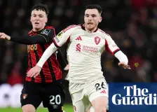 RFU targets transport revamp and undercover police to sway Twickenham residents over concert plan15:18 Fresh proposals to address road issues and bad behaviour RFU needs gigs to pay for £660m Twickenham upgrade The Rugby Football Union is hopeful a proposed overhaul of Twickenham rail station and the deployment of undercover police officers on matchdays will help sway opponents of plans to host more concerts to pay for the £660m stadium upgrade. The union is seeking to increase the number of non-s… ‘He’s taken his punishment’: Root lauds Brook after England’s win in Sri Lanka15:18 Joe Root also praises Brendon McCullum’s coaching Sri Lanka win was Brook’s first ODI win abroad as captain Joe Root has lavished praise on Harry Brook and Brendon McCullum after the pair celebrated their first one‑day international victory abroad while in charge of England’s white-ball teams. Root’s 75 was the guiding hand in England’s five-wicket win against Sri Lanka on Saturday, ending a losi… Manchester United beat Arsenal … has the wobble begun? Football Weekly – video15:18 Max Rushden is joined by Will Unwin, Robyn Cowen and Mark Langdon as Manchester United win 3-2 away at Arsenal in the game of the season so far Subscribe to The Guardian Football Weekly ► https://www.youtube.com/@FootballWeeklyPodcast?sub_confirmation=1 On the podcast today; Michael Carrick’s dream start as interim at Manchester United continues with a 3-2 win at Arsenal. It’s Arsenal’s first hom… Ødegaard admits Arsenal title tilt fuelled by pain of three runners-up finishes14:43 Captain says it is a ‘good factor’ in Premier League push Arsenal ‘not good enough’ against Manchester United Martin Ødegaard says that Arsenal’s near misses in the Premier League over the past three seasons are on the players’ minds – but only in a way to motivate them to go all the way this time. The captain sought to push a line that Mikel Arteta has also mentioned – the need to stay in the mo… Serie A’s ‘mega tie-breaker’ leaves Inter clear but Juve catch the eye again | Nicky Bandini14:43 Inter and Juventus exchanged remarkable home victories, while dominant Roma were held to a draw at home by Milan Lady Gaga’s electropop banger Born This Way is 15 years old, but by the standards of some Serie A stadium DJs that makes it positively modern. Thumping out at the Olimpico on Sunday night it somehow felt timely. Roma were on the right track, baby, after a first half in which they thoro… Lucas Vásquez leads way for old-timers to give Leverkusen lift-off in 2026 | Andy Brassell14:43 Team with an average age of just under 29 finally ended their losing streak since turn of the year The biggest cheer of the afternoon at the BayArena was a result from elsewhere. A stunning first league defeat of the season for Bayern Munich at home to Augsburg was not important in any sort of title race context – any faint thoughts of that disappeared a while back, and not just for Bayer Leverku… Heading ball ‘likely’ contributed to Gordon McQueen’s brain injury, coroner finds14:08 Former Scotland defender, who played for Manchester United and Leeds during a 16-year career, died at his home in 2023, aged 70 Heading a football “likely” contributed to the brain injury which was a factor in the death of the former Scotland defender Gordon McQueen, a coroner has found. McQueen – who was capped for Scotland 30 times between 1974 and 1981, and played for both Manchester United an… Inglis to splash out on new toaster ‘and maybe the kettle’ after Swiatek ends Melbourne run14:08 Qualifier leaves with $480k after 0-6, 3-6 defeat Inglis exit ends Australian interest in women’s singles Maddison Inglis leaves Melbourne Park with a lot, including the high-end toaster she’s always wanted. There is pride, having reached the round of 16 at the Australian Open, but also disappointment. In the biggest match of the local qualifier’s career, the world No 2 Iga Swiatek proved too pol… WSL talking points: Liverpool finally get first win but are Chelsea out of title race?13:33 With Chelsea stumbling at the hands of Arsenal at the top, bottom club Liverpool finally ended their long wait The Arsenal head coach, Renée Slegers, was effusive in her praise of her players’ ability to make things happen when their backs are firmly against the wall. After a dominant 2-0 win over Chelsea at Stamford Bridge she was asked about the Gunners’ ability to defy the odds and win against… Liverpool pull out of talks with Spurs over Andy Robertson transfer12:59 Liverpool have no cover for Robertson and Milos Kerkez Left-back, whose deal ends in June, has not asked to go Liverpool have pulled out of talks with Tottenham over their approach for Andy Robertson. Spurs made their move late last week as Thomas Frank sought to add much-needed experience to his squad. Liverpool listened to the approach in recognition of Robertson’s contribution to the club in t… A Saturday and a state killing: soccer as Minnesota is torn apart | Jeff Rueter12:25 On the whims of Fifa’s Peace Prize winner, a life usually so focused on sports has found anything but peace It’s Saturday morning, and news breaks shortly after the Premier League kickoff window; another member of your community has been brutally killed in the streets by ICE. There are already a few videos on social media, depicting multiple angles of the grotesque scene. This killing, like the o… Sign up for the Winter Olympics 2026 daily briefing: the best of the Olympics and Paralympics12:25 Running throughout the Winter Olympics and Paralympics, a guide to the day’s highlights and the best that is yet to come Continue reading... Premier League: 10 talking points from the weekend’s action9:36 Casemiro is thriving under Michael Carrick, Newcastle look short of ideas and Sean Dyche takes aims at … towels? Casemiro will depart Manchester United this summer . His four ye