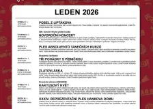 Folkové večery v Umělecké kolonii0:54 V umělecké kolonii Bastion No. IV v Josetově se v lednu až březnu 2026 koná série hudebních vystoupení. Akce začínají vždy od 19:00 a občerstvení bude zajištěno. Vstupné je dobrovolné. BASS-TION TYDLIPIDLI TEKK0:54 Akce TYDLIPIDLI TEKK se koná 23. ledna 2026. Zveme všechny zájemce, kteří chtějí strávit příjemné chvíle a zapojit se do programu, který jsme pro vás připravili. Disco párty s DJ FAKTP0:54 Přijďte na disco párty s DJ FAKTP. Využijte příležitosti tančit a bavit se na skvělé hudební rytmy v příjemném prostředí. Otevřený ateliér18.ledna Vlněný ateliér je určen pro všechny, kteří chtějí objevovat nové techniky v textilním umění. Akce se koná každou čtvrtek od 1. září 2025 do 30. června 2026 v Umělecké kolonii Bastion IV. v Jaroměři - Josefově. Přineste si jehlice a přijďte posedět s ostatními nad šálkem čaje. Všichni jsou vítáni. Beauty party18.ledna Přijďte na bezplatnou Beauty party, kde se dozvíte, jak správně pečovat o pleť a vyzkoušíte si různé kosmetické doplňky. Akce se koná ve středu, 22. ledna 2025. Rezervujte si své místo na telefonním čísle 740 758 34. Přednáška z cyklu Mezi řádky: Stavebně technologický vývoji pivovarů a pivovary v okolí Jaroměře18.ledna Přijďte na přednášku Milana Starce, která se zaměří na stavebně-technologický vývoj pivovarů a pivovary v okolí Jaroměře. Přednáška se koná ve čtvrtek 22. ledna 2026 v 17:30 v Městském muzeu v Jaroměři. Vstup je volný, takže je to skvělá příležitost pro všechny zájemce o historii a architekturu. Gastrokalendář restaurace Pasáž18.ledna Valentýn v pasáži se koná ve dnech 14. a 15. února. Tato akce je určena nejen pro zamilované, ale pro všechny, kdo chtějí zažít romantickou atmosféru a vychutnat si lahodné pokrmy. Přijďte si užít společné chvíle s vašimi blízkými. Tajemství staré čarodějnice18.ledna Loutkové divadlo Maminy Jaroměř vás zve na představení 'Kašpárkovy večerníčky pro kluky a pro holčičky', které se koná v pátek 23. ledna 2026 ve 15:30, 16:30 a 17:30 hodin. Přijďte si poslechnout tajuplný příběh o staré čarodějnici, jejích dvou dcerách a tajemství, které ukrývá ve starém vědru. Předškolička: Dobrý start ZŠ Jaroměř Na Ostrově17.ledna Zveme vás na akce pro děti, kde se můžete těšit na básničky malého plavčíka a Vánoční Ostrov. Přijďte si užít zábavu a tvoření s námi! Klubová setkání seniorů v lednu 202617.ledna Seniorský klub Oblastního spolku Českého červeného kříže Náchod, pobočka Jaroměř, Vás srdečně zve na klubová setkání v lednu 2026. DOBRÉ RÁNO S FINDOU16.ledna Nekorektní komedie o hyperkorektnosti, v níž autor a režisér Jan Svěrák trefně komentuje témata dnešní společnosti, a přitom otvírá dilemata, která rozčeří názory diváků. Večerní kresba16.ledna Každé úterý se můžete zúčastnit večerní kresby, která se koná od 18:00 do 20:00 v Bastionu IV,. Přijďte si užít kreativní čas a vyměnit si zkušenosti s ostatními účastníky. |