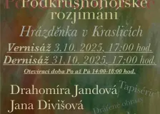 VÝSTAVA TEXTILNÍCH VÝROBKŮ A DEKORACÍ20.října - technika patchwork od paní Marie Zdebské - místo: Městská knihovna Kraslice - čas: v době výpůjčních hodin BAZÁREK OBLEČENÍ11.října HALLOWEEN11.října 20. POHÁDKOVÝ PODZIM2.října KRUŠNOHORSKÉ ROZJÍMÁNÍ2.října - výstava v kraslické hrázděnce - otevírací doba: pondělí - pátek 14:00 - 18:00 h - vernisáž výstavy: 3. 10. 2025 v 17:00 h - dernisáž: 31. 10. 2025 v 17:00 h |